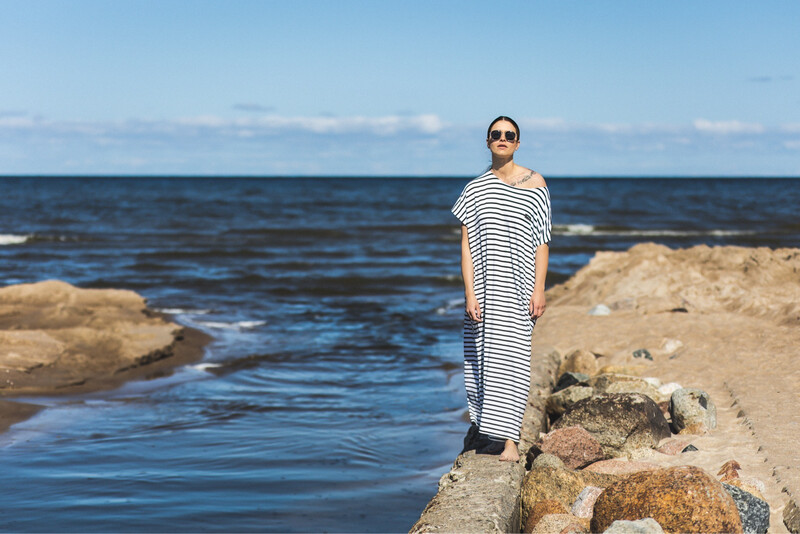 Marinistinio stiliaus suknelė, įkvėpta saulės ir jūros, burlaivių mažame uoste, žuvėdrų klyksmo… Širdžiai saldžios laisvės ir beribės meilės sau.