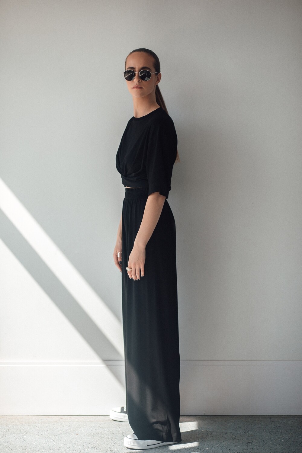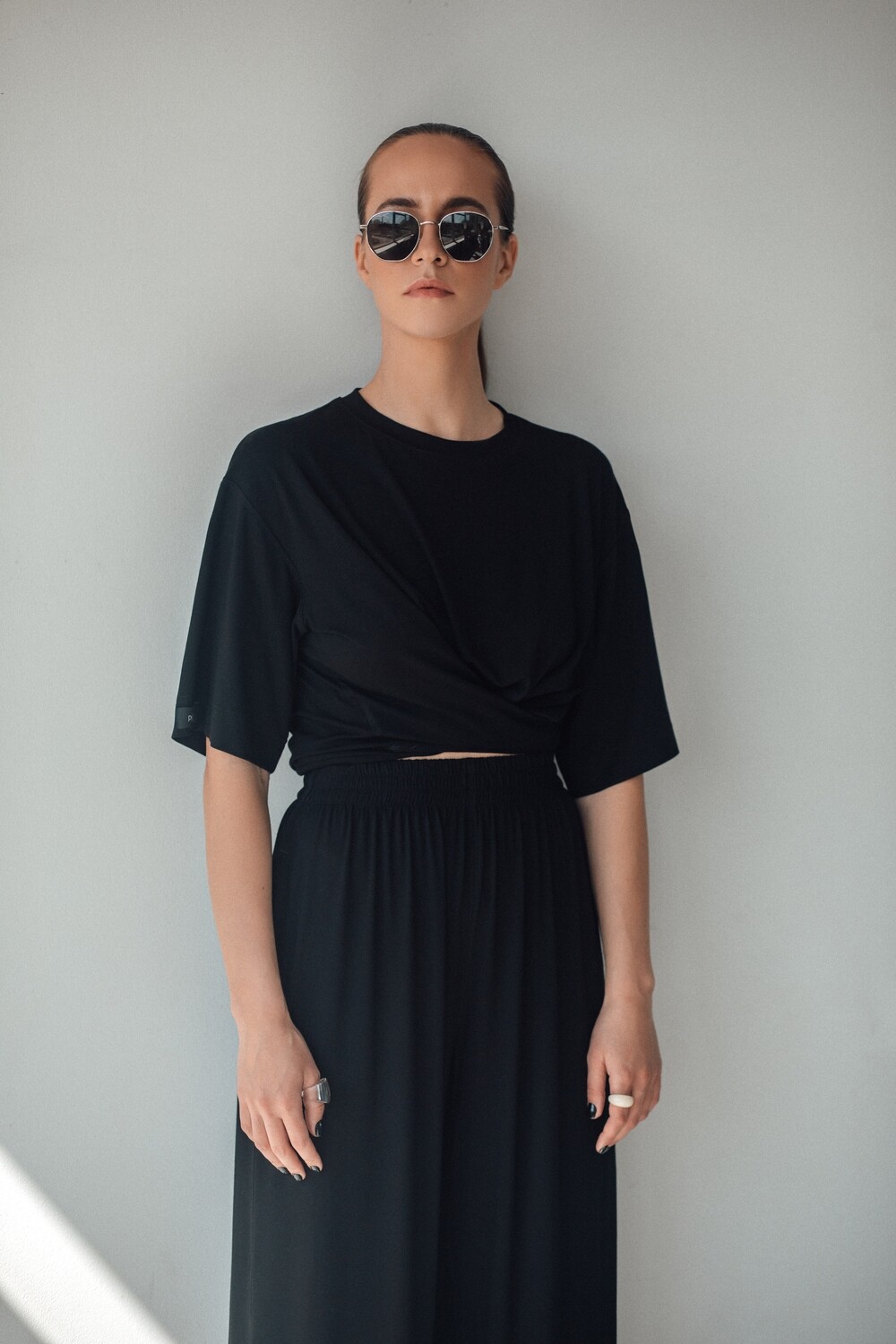Kelnės plačios ir itin gražaus kritimo, kurį joms suteikia šis nuostabus trikotažas. Kaip visuomet – aukštas liemuo, kišenės ir maxi ilgis.