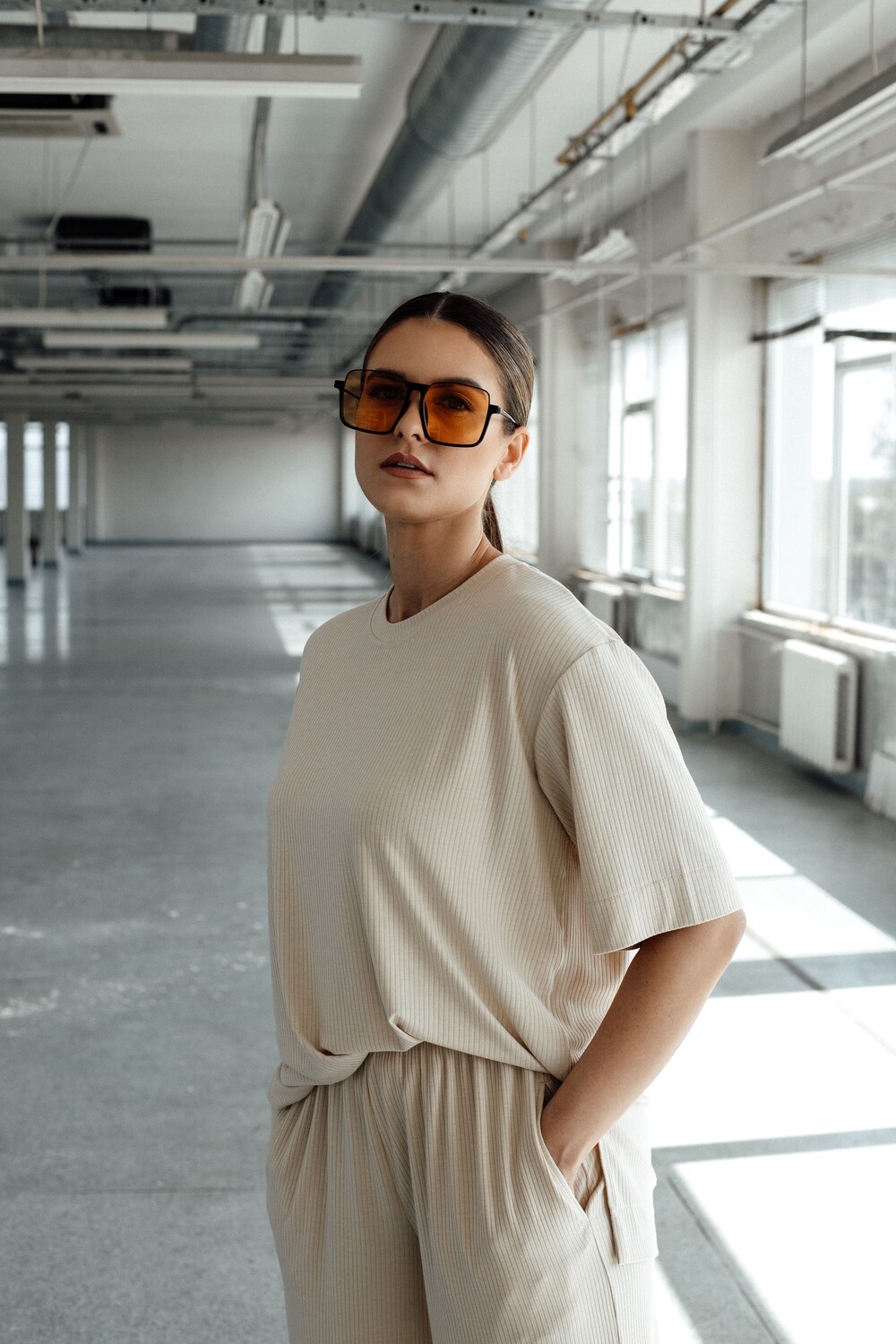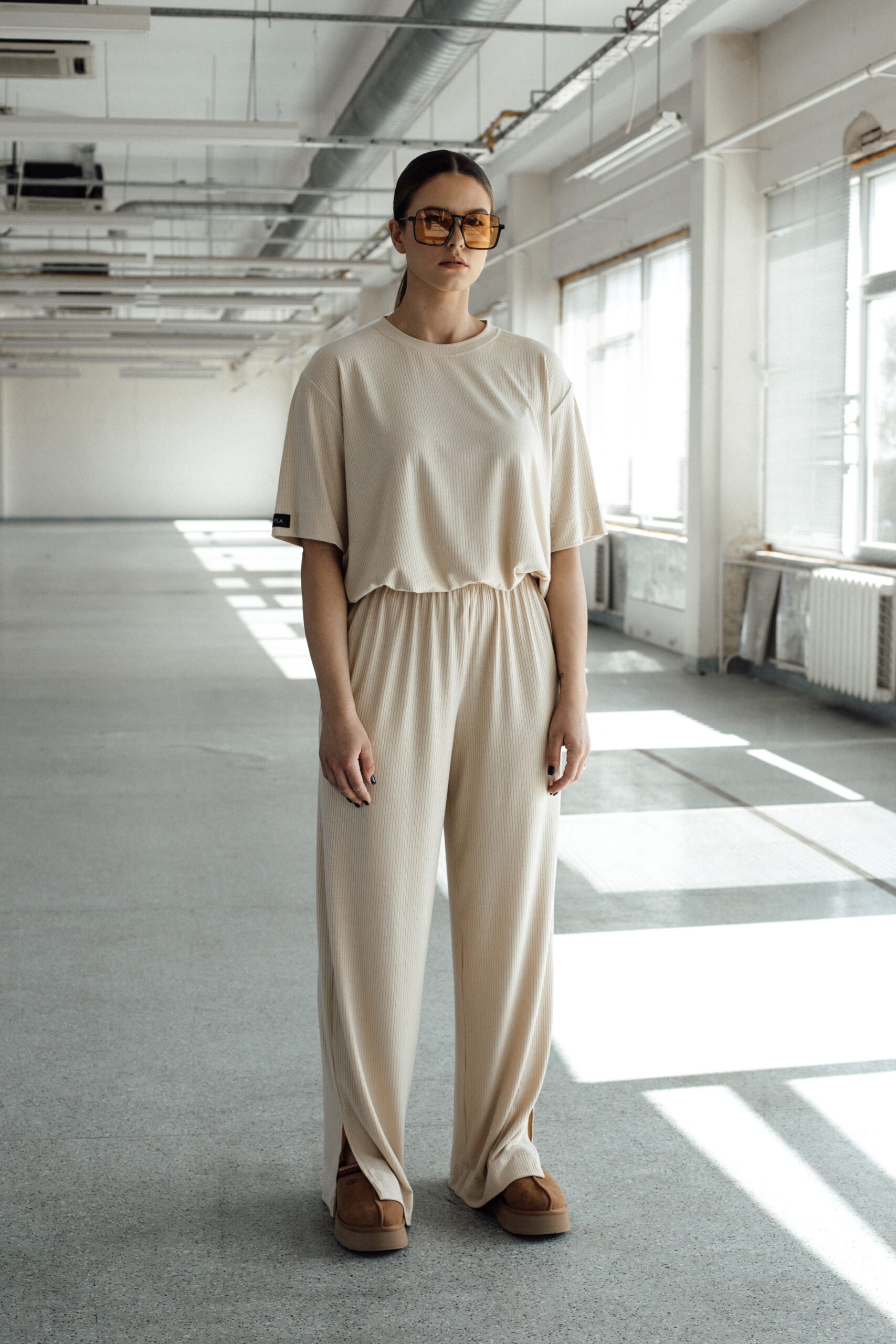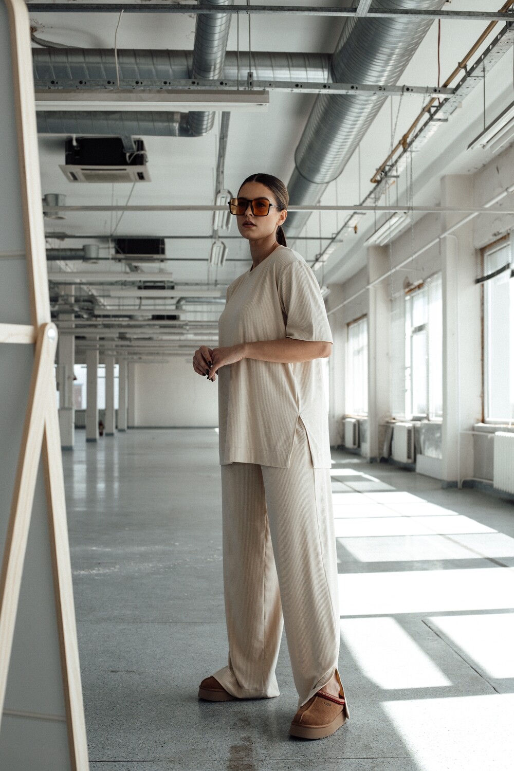 COLUMN kostiumėlis – kalba apie vidinę stiprybę. Tai stilinga, stulpelių rašto, labiau klasikinio kostiumėlio interpretacija, pagaminta iš trikotažo.
