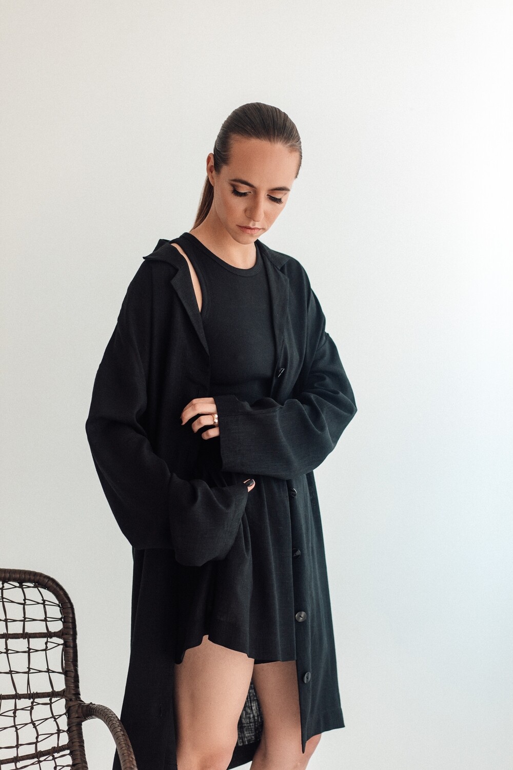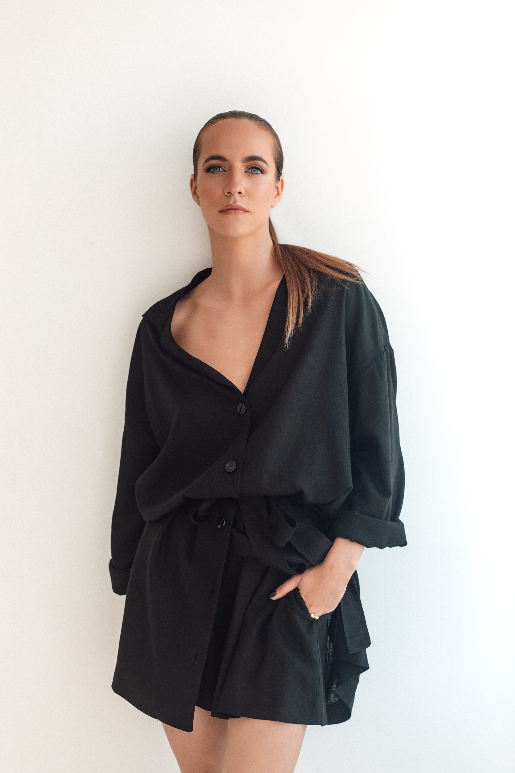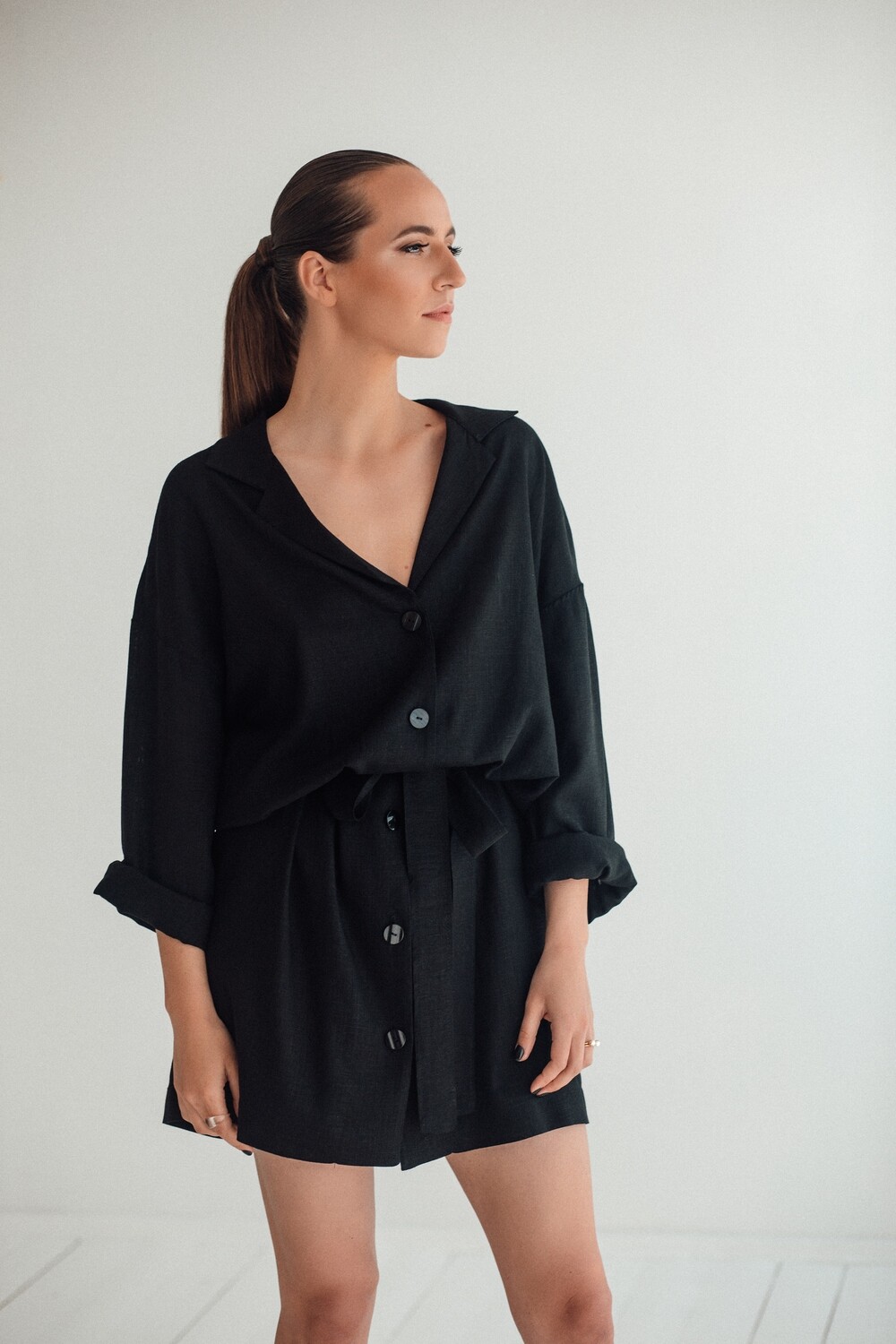 Šie marškiniai gali atlikti dar vieną funkciją ir tapti tarsi chalatas ant pvz. maudymosi kostiumėlio, kavinėje prie jūros. Pasileiskite diržą ir marškiniai pavirs pusilge susagstoma suknele.