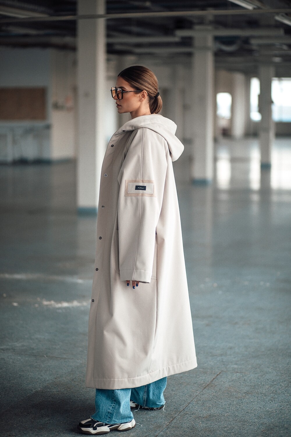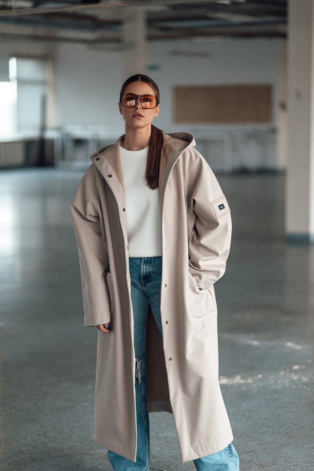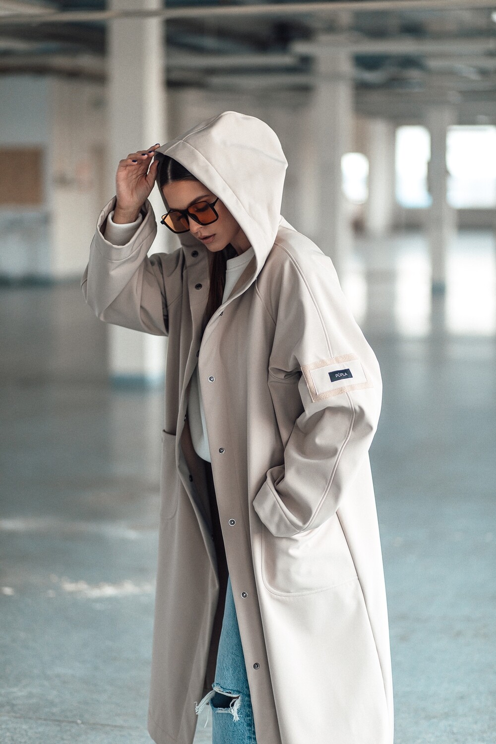 Ilgos rankovės, didelis kapišonas, šponkė aukščiausioje lietpalčio vietoje, kuri saugos kaklą nuo vėjo ir lietaus. Neperšlampanti, matinė medžiaga, vidinėje pusėje padengta flysu, kurio dėka lietpaltis nėra tarsi šaltas ir plastmasinis medžiagos gabalas.