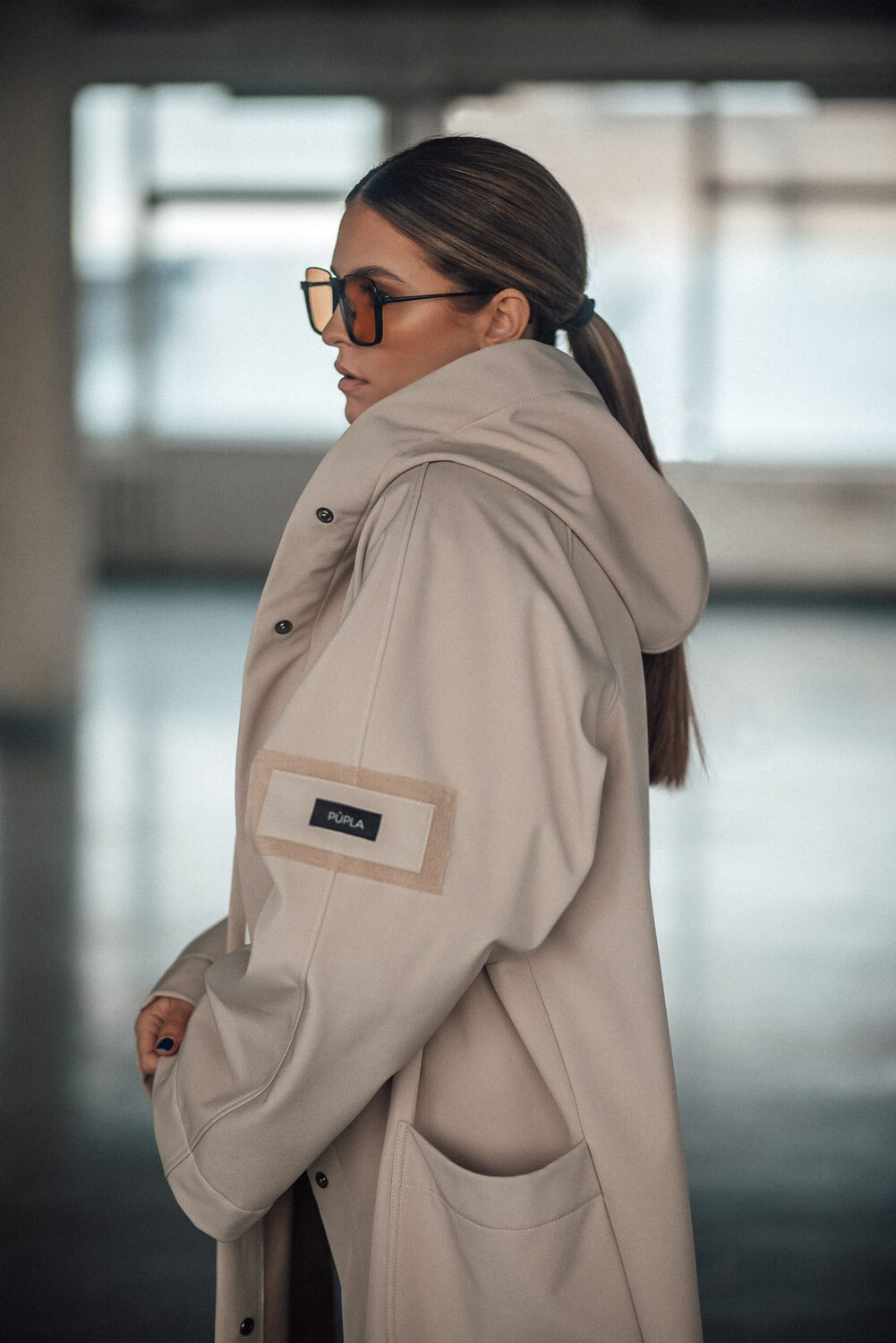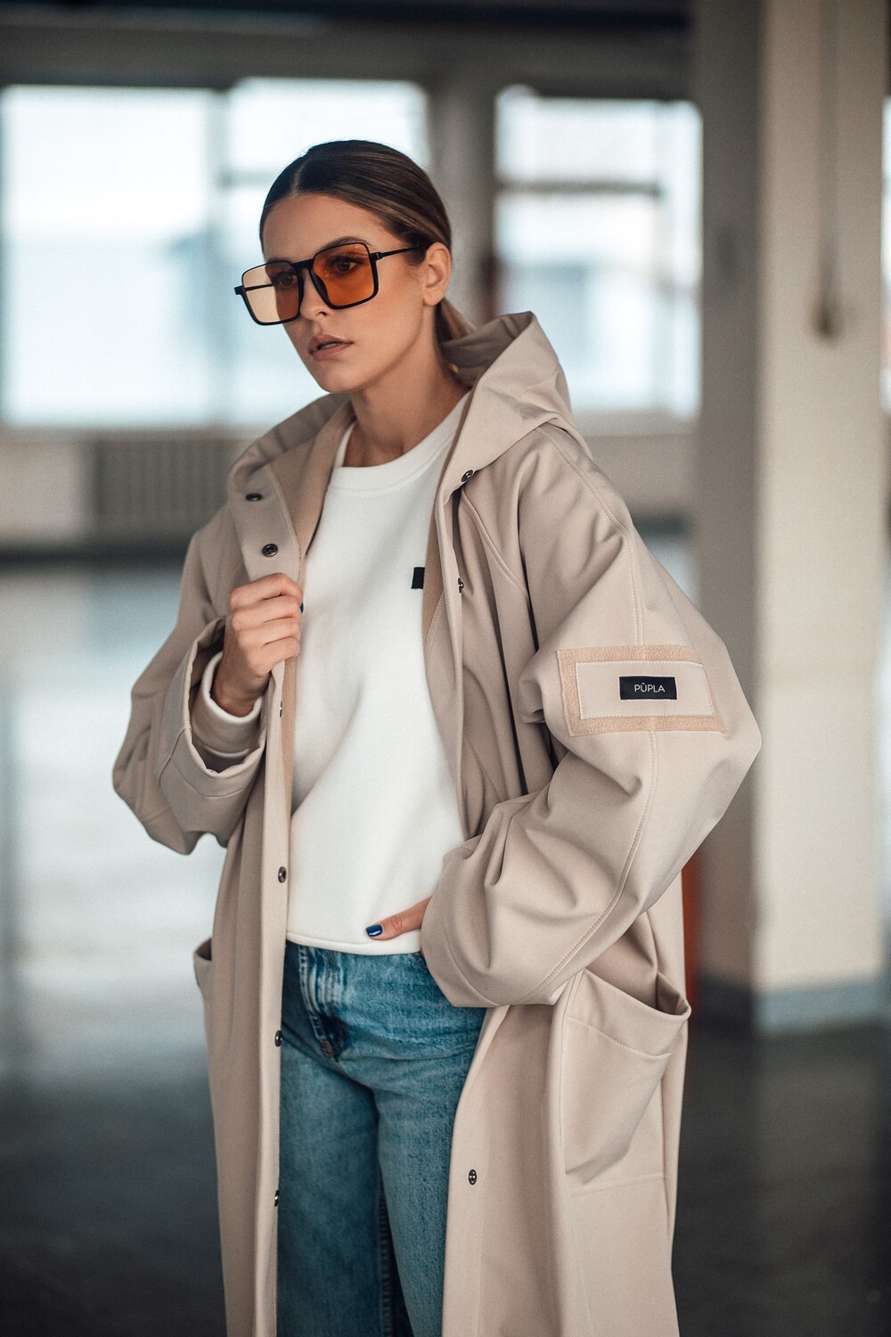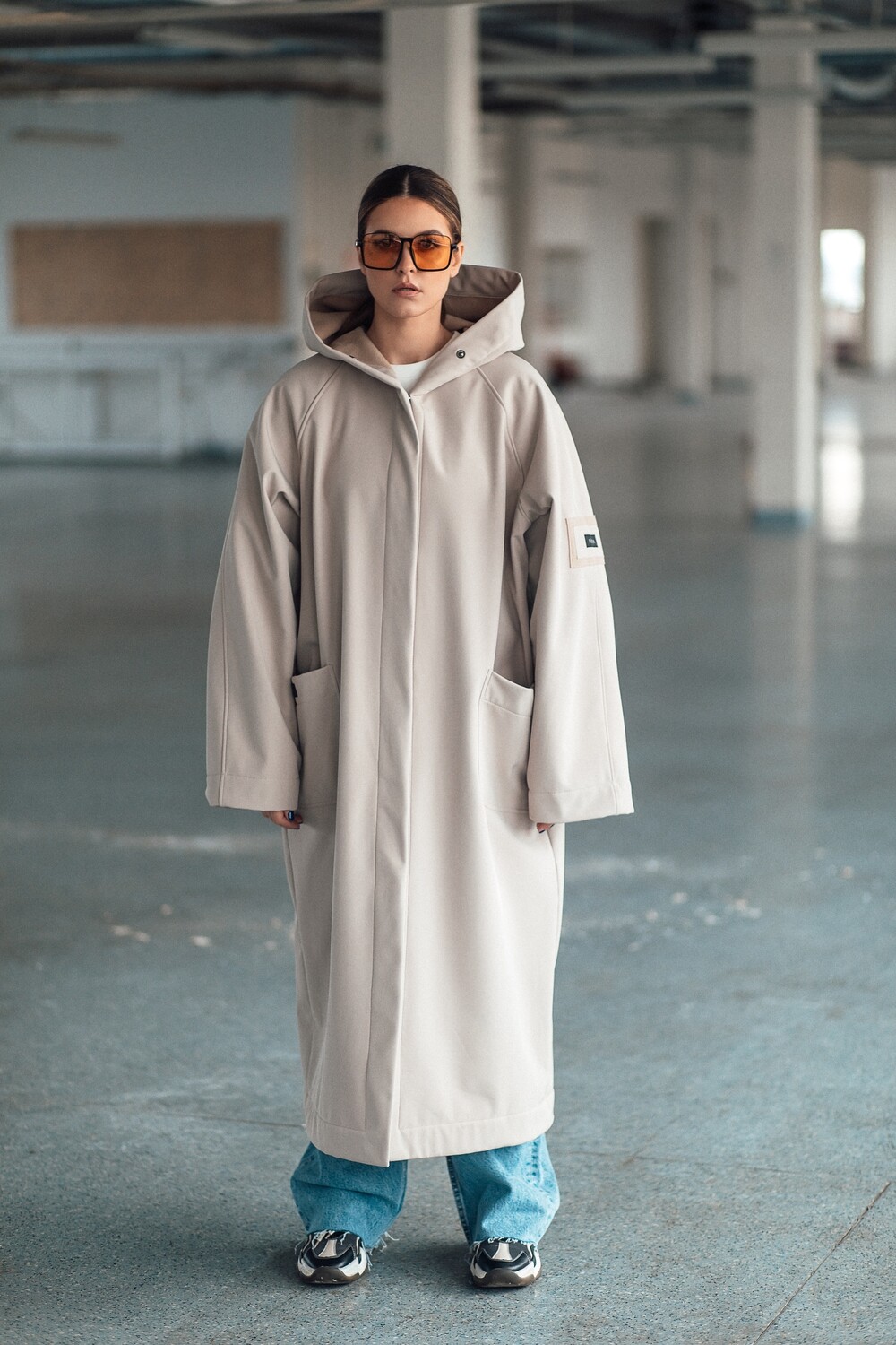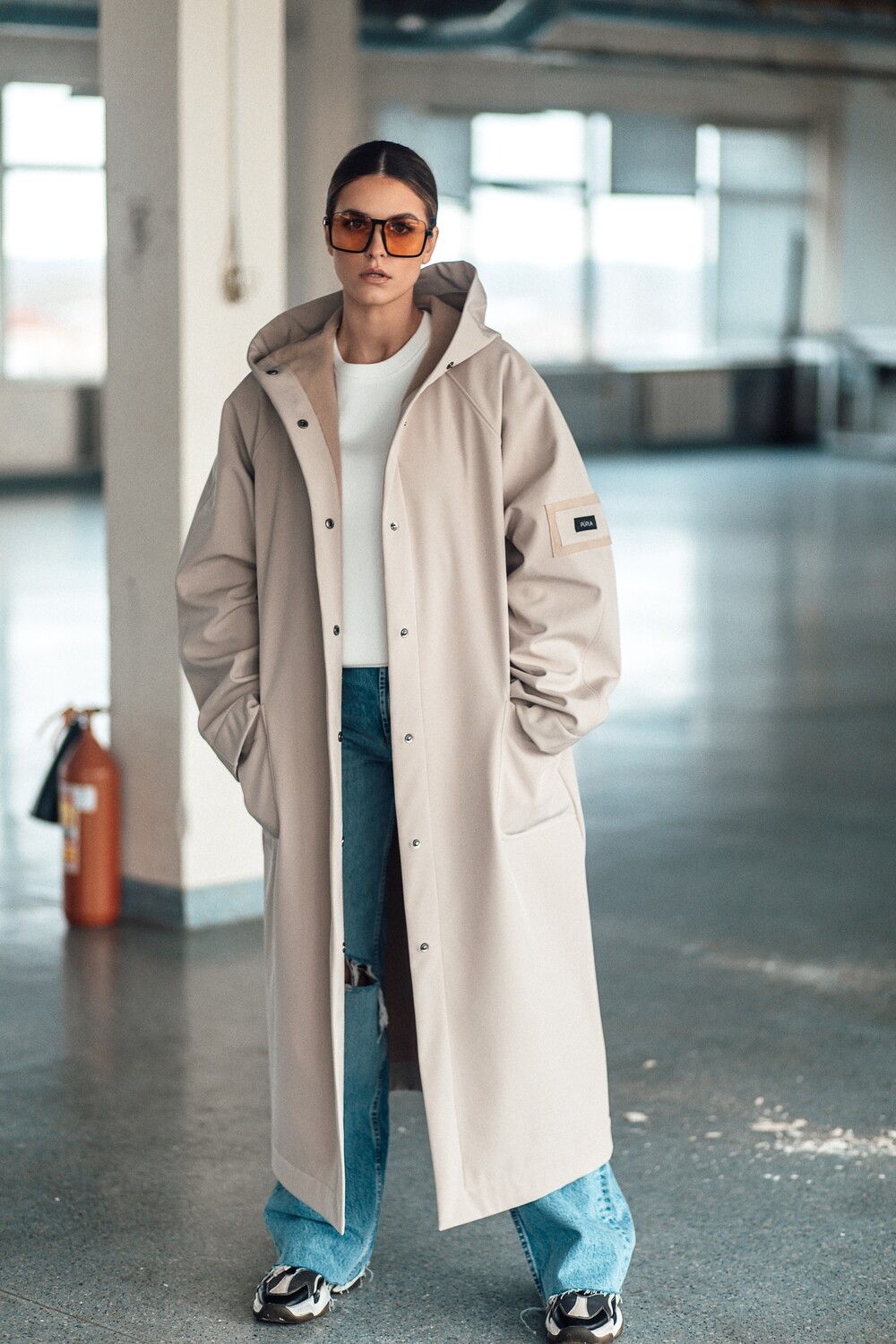 Ilgos rankovės, didelis kapišonas, šponkė aukščiausioje lietpalčio vietoje, kuri saugos kaklą nuo vėjo ir lietaus. Neperšlampanti, matinė medžiaga, vidinėje pusėje padengta flysu, kurio dėka lietpaltis nėra tarsi šaltas ir plastmasinis medžiagos gabalas.