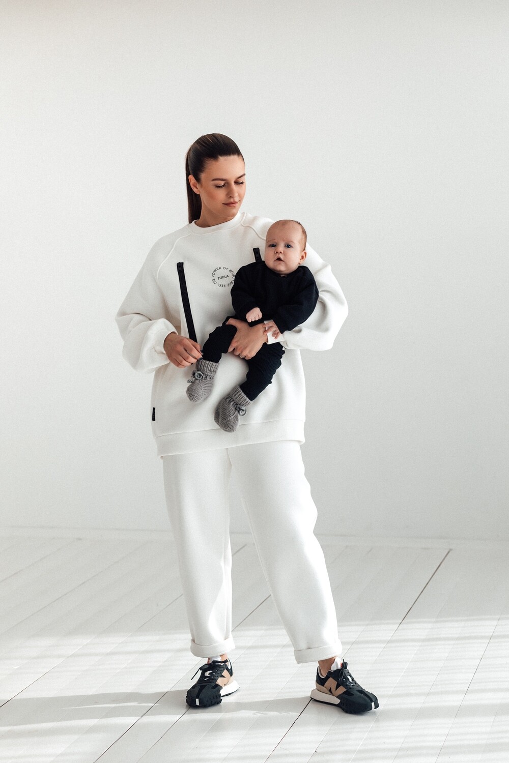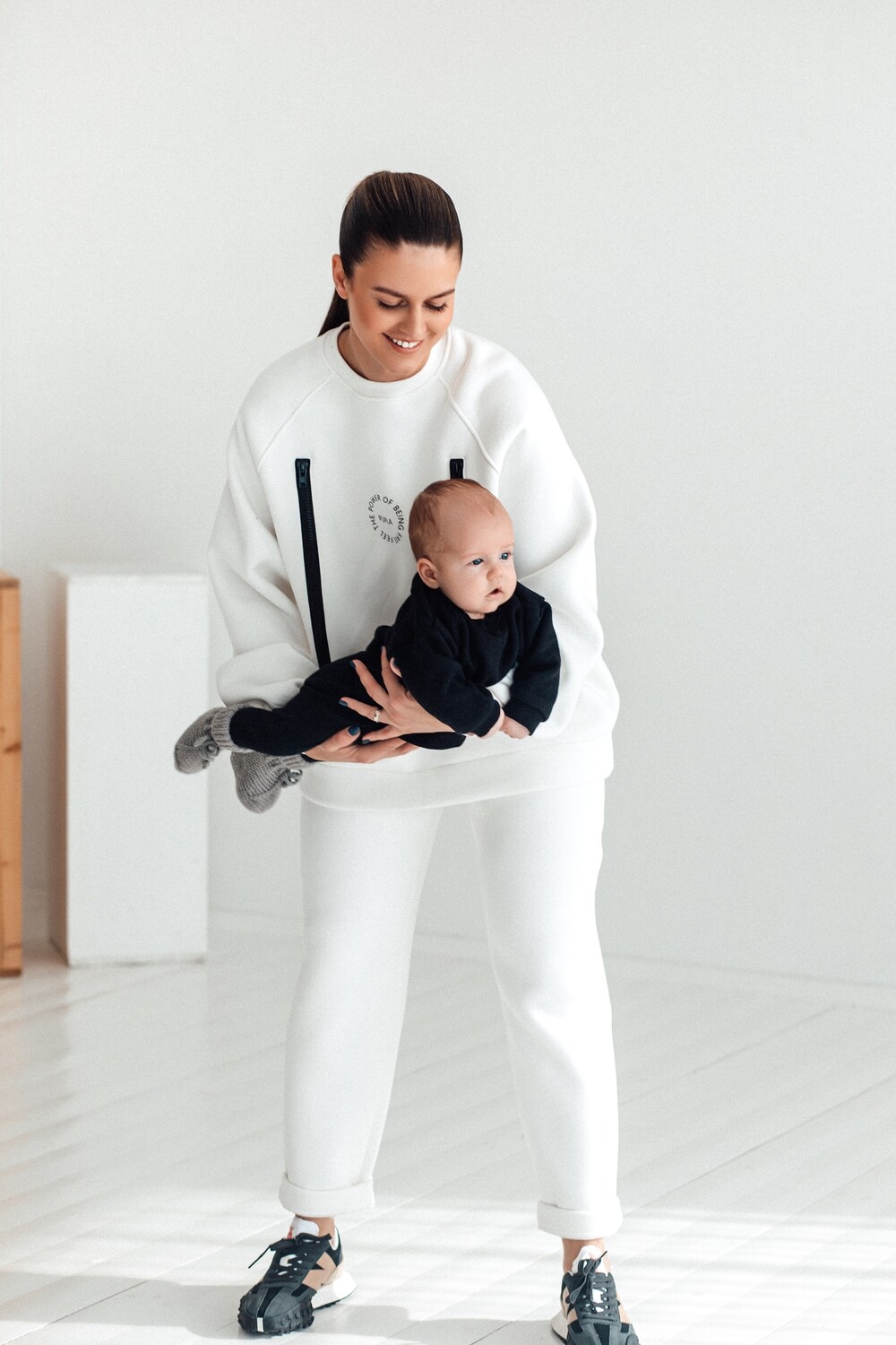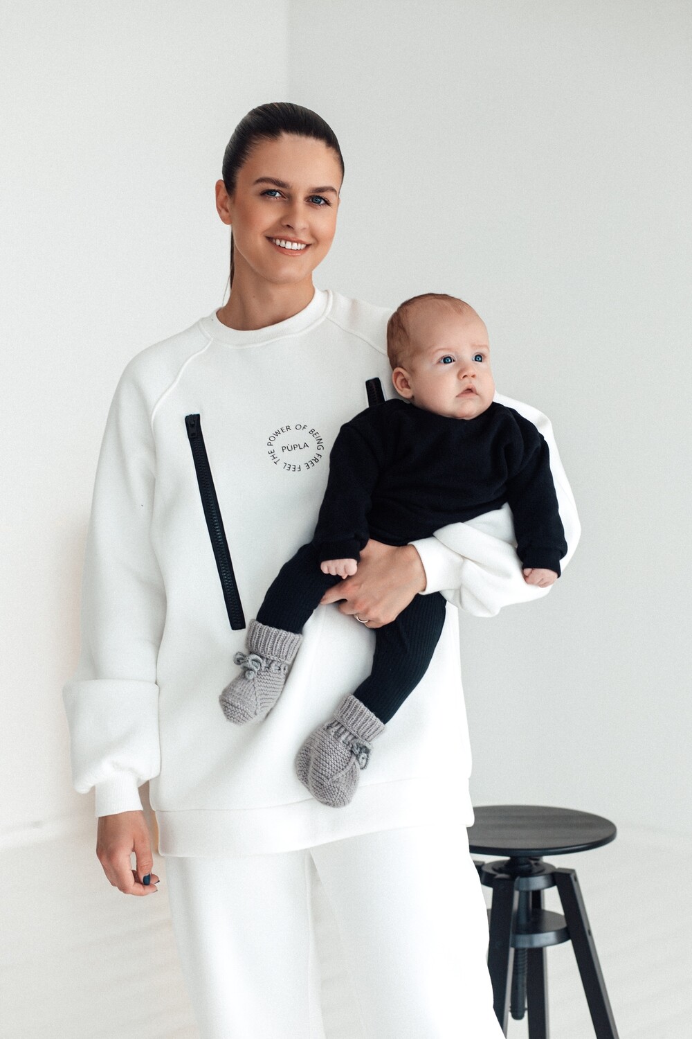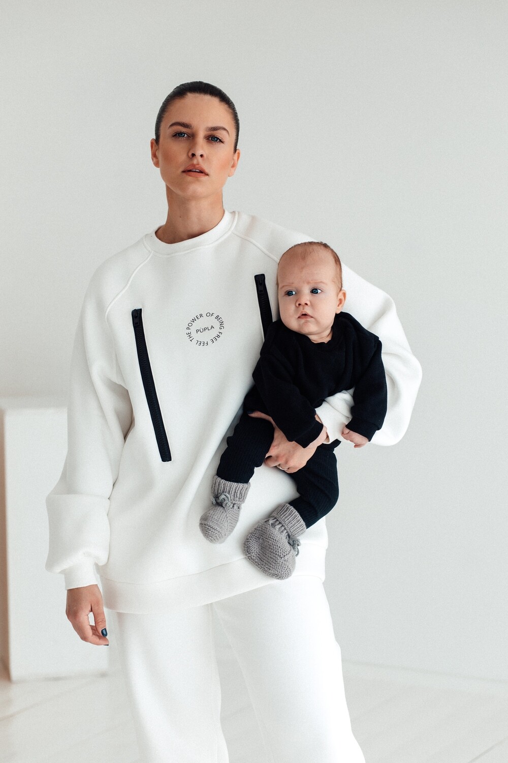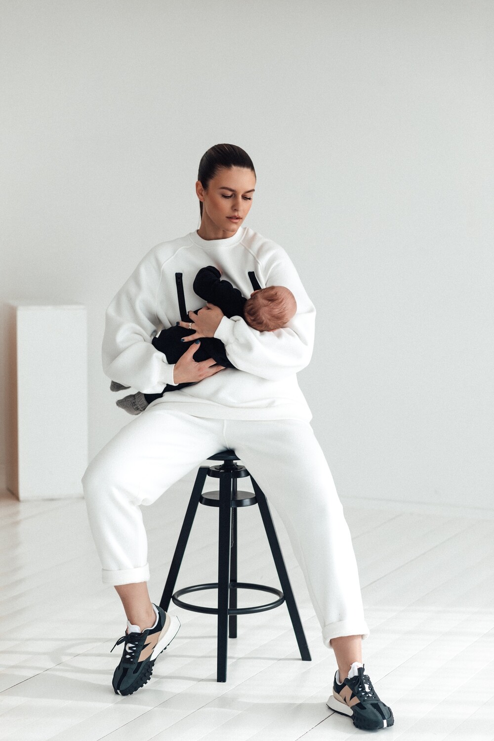 Plačiai atsitraukiantis užtrauktukas neliečia veido, todėl nežalojama jautri kūdikio odelė. Na, o pats džemperis itin stilingas, užtrauktukai atrodo dekoratyviai ir jis tikrai nėra skirtas tik mamoms. Ar mieste sutikus moterį su šiuo džemperiu, pagalvotumėte kokią funkciją jis atlieka? Nemanau.