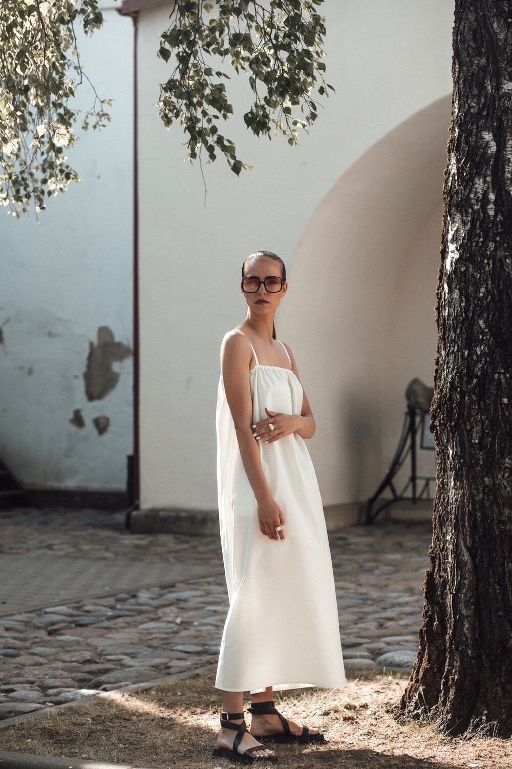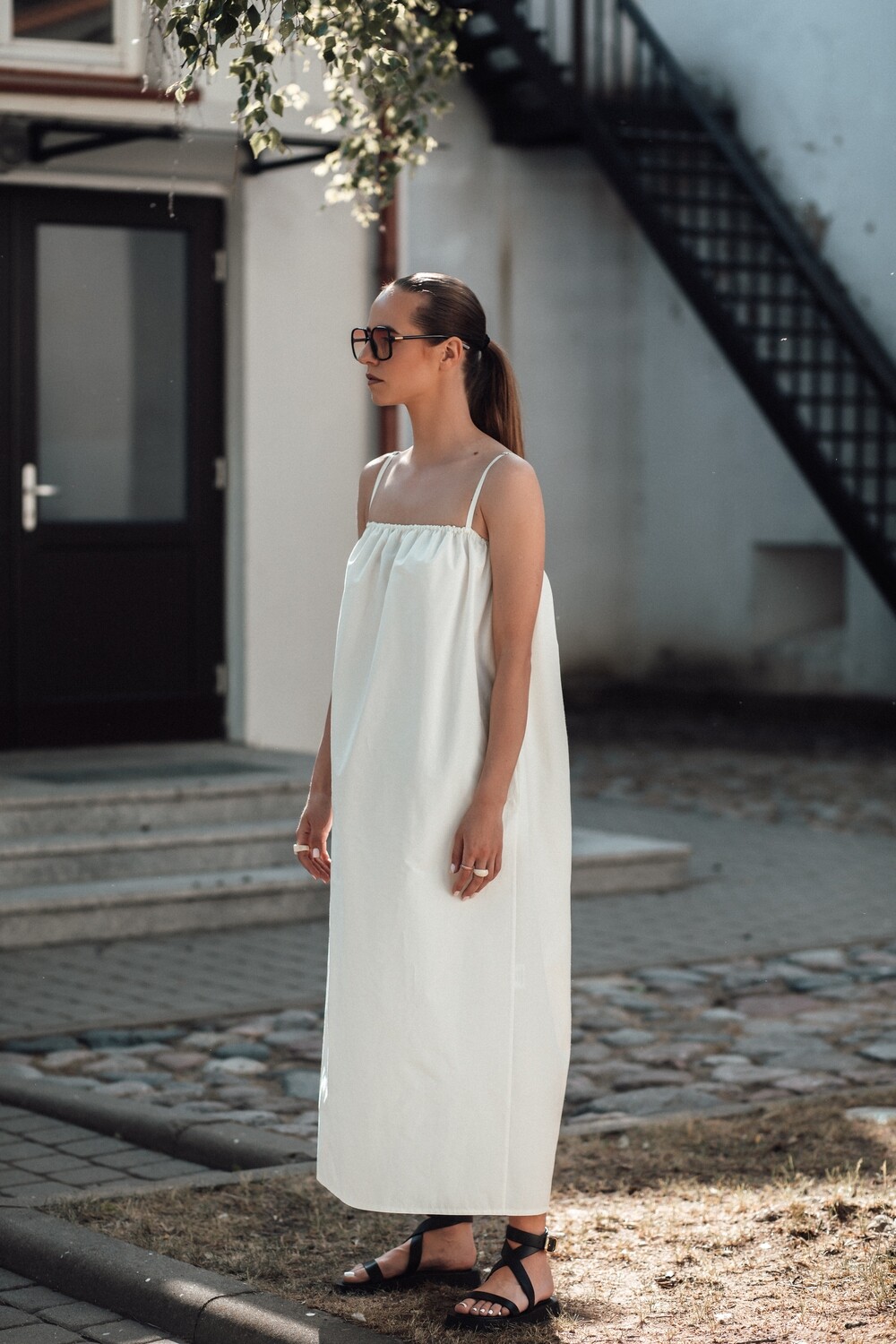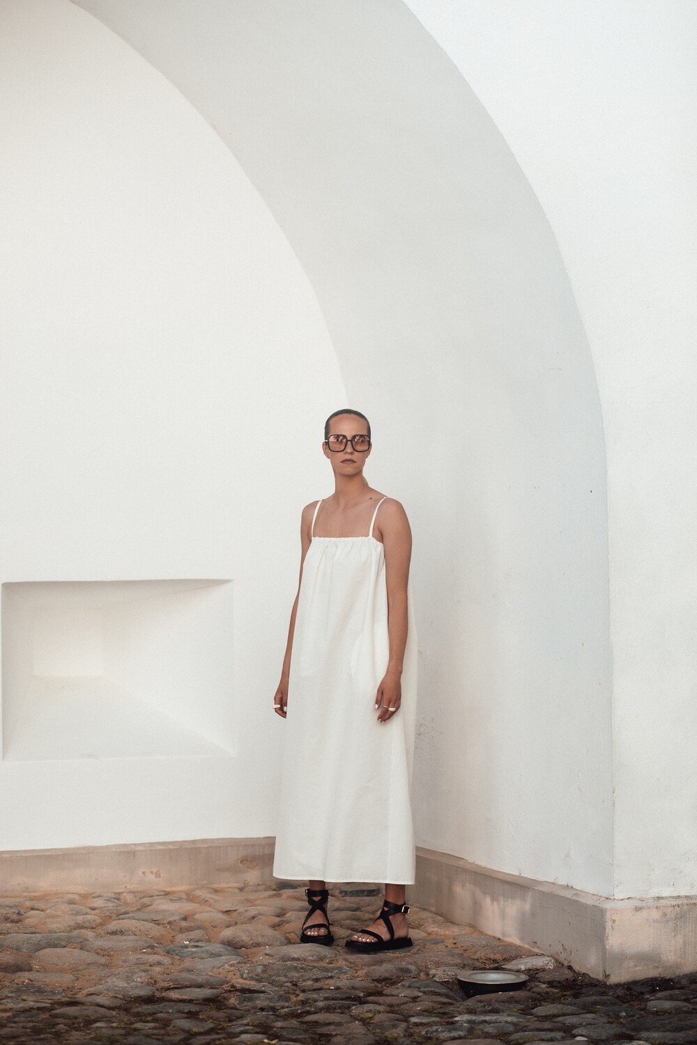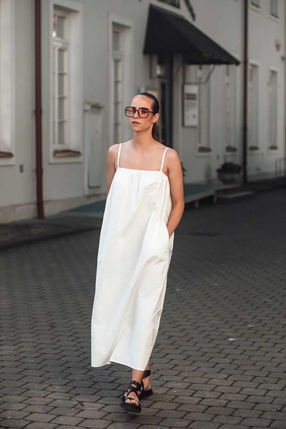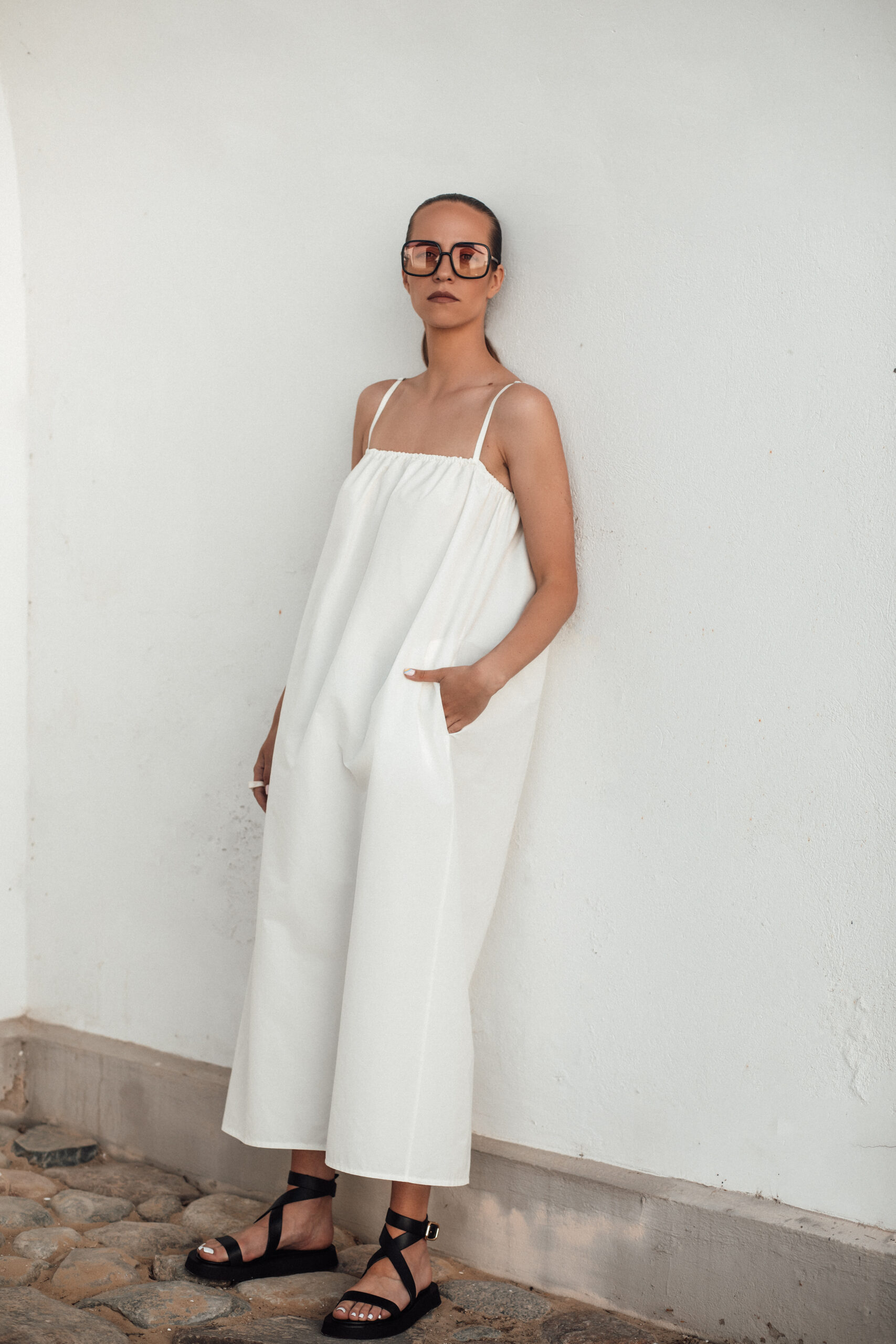 Itin minimalaus dizaino suknelė. Su kišenėmis šonuose, reguliuojamomis petnešėlėmis. Ir pagaminta iš nematyto ir charakteringo audinio – medvilnės su atmintimi. Kodėl su atmintimi? Nes šios suknelės audinys įsimena kiekvieną susiglamžymą ir neleidžia jam išnykti. Būtent šiam audiniui ši savybė yra privalumas, jo cinkelis ir tikrai ne minusas. Ji tokia specialiai gaminama. To nereikia bijoti, o tik džiaugtis, nes minimaliam suknelės dizainui ši savybė itin tinka. Tuo pačiu šis audinys tvirtas ir gana puikiai laikantis savo formą. Jūs tikrai nesate nieko panašaus lietusi, pažadame.